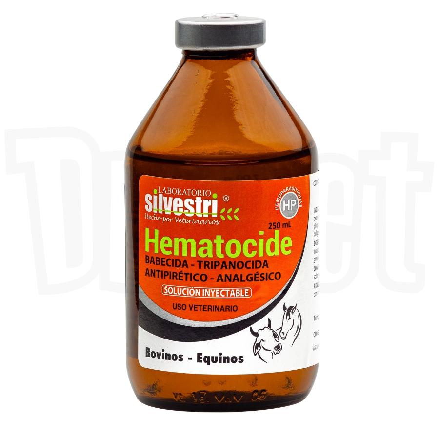HEMATOCIDE es ideal para tripanosomiasis bovina y equina (huequera, derrengadera, cachera, renguera, mal de cadera, cacho hueco, secadera); babesiosis o piroplasmosis bovina y equina (fiebre de garrapatas, ranilla roja, ranilla de sangre, tristeza del ganado); infecciones mixtas por tripanosomas y babesias.